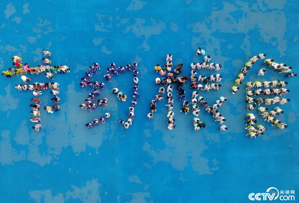 2019年10月15日,浙江金華,武義縣武陽幼兒園的小朋友在操場排成“節(jié)約糧食”四個大字,倡導節(jié)儉新風尚。圖片來源:視覺中國