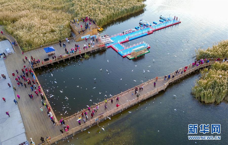 10月17日,游客在居延海岸邊的木棧道上觀賞水鳥。新華社記者 彭源 攝