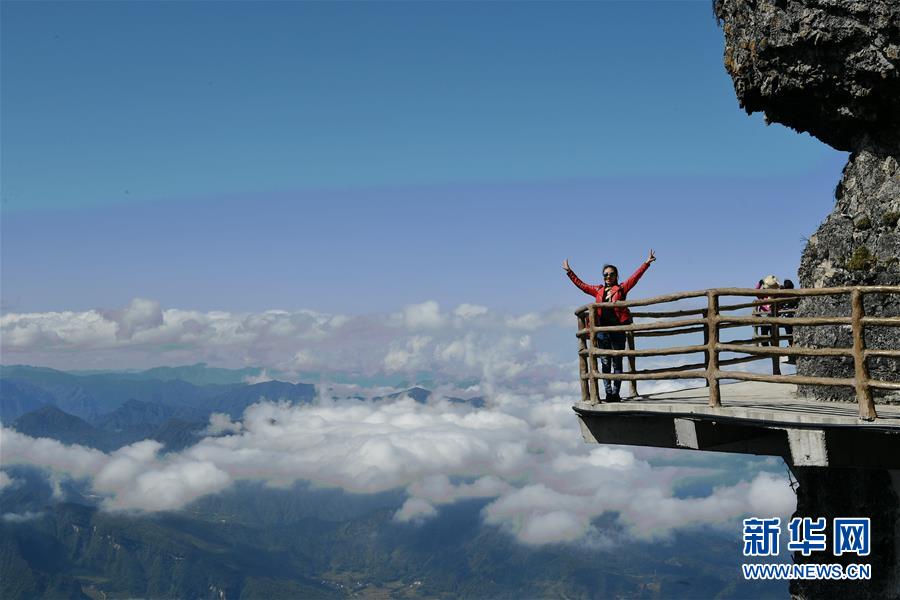 10月17日,游客在漢中市南鄭區(qū)龍頭山風(fēng)景區(qū)拍照。  陜西省漢中市南鄭區(qū)龍頭山風(fēng)景區(qū)位于川陜交界處米倉山主梁。龍頭山景區(qū)常年云霧繚繞,宛如仙境,還有奇石、云海、彩林、霧凇等景觀令游客流連忘返。 新華社記者 張博文 攝