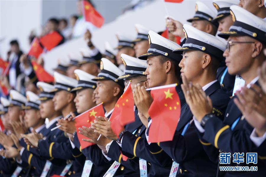 10月20日,中國隊選手吳慧敏(右)、包雪怡在升旗儀式上。 當日,在武漢舉行的第七屆世界軍人運動會水上救生項目女子50米假人救生決賽中,中國隊選手吳慧敏以33秒93的成績奪得冠軍,隊友包雪怡以35秒79的成績獲得亞軍。 新華社記者肖藝九攝