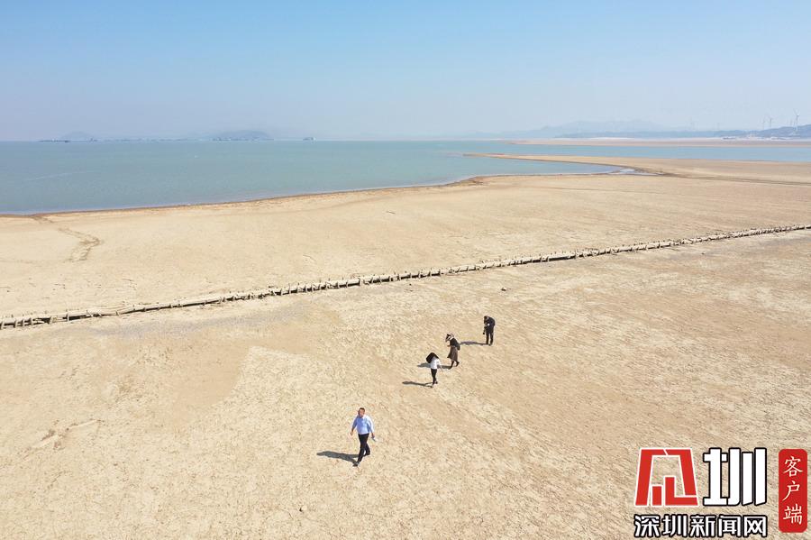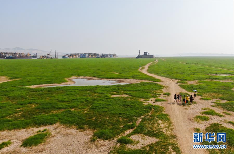 10月9日,江西省廬山市,游客行走在鄱陽(yáng)湖湖區(qū)干涸的湖面上。新華社記者胡晨歡攝