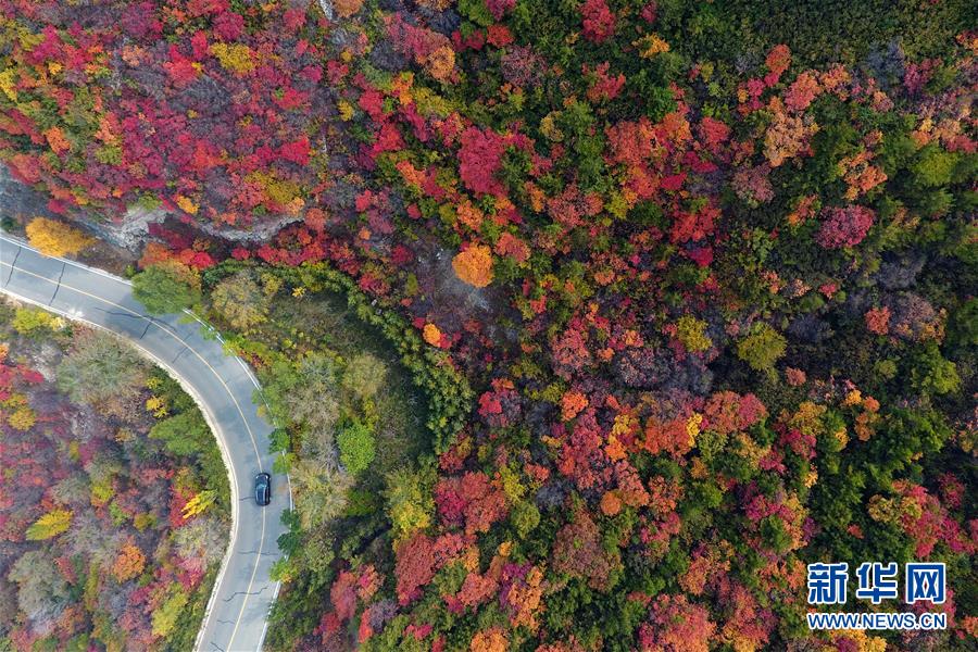 車輛行駛在山西省太原市玉泉山盤山公路上(10月22日無人機拍攝)。