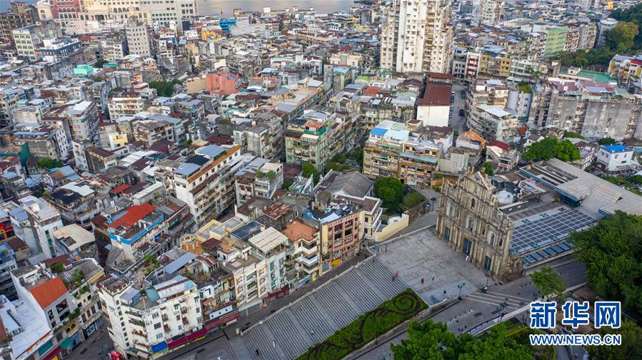 10月24日早晨無(wú)人機(jī)拍攝的澳門著名歷史遺跡——大三巴牌坊及周邊區(qū)域。2018年10月23日,港珠澳大橋正式開通。新華社記者張金加攝