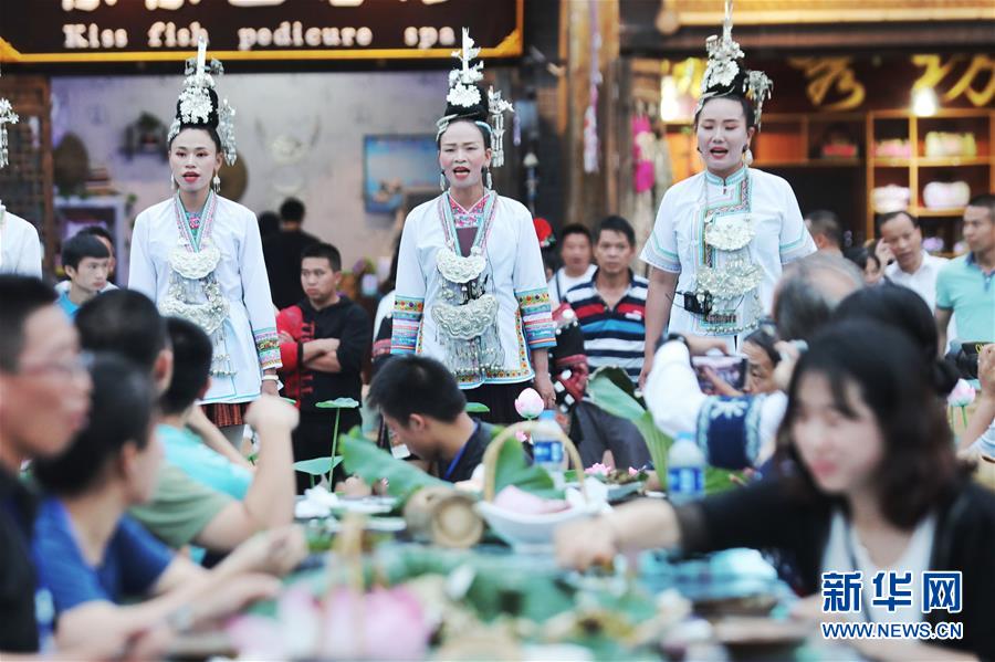 當(dāng)日,貴州省黔東南苗族侗族自治州丹寨縣迎來苗族傳統(tǒng)節(jié)日“吃新節(jié)”,游客與苗族同胞在萬達(dá)小鎮(zhèn)參加“萬人長(zhǎng)桌宴”,歡度節(jié)日,慶祝豐收。