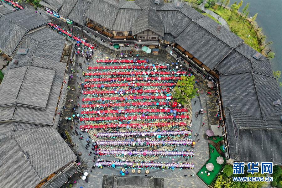 丹寨縣萬達(dá)小鎮(zhèn)“萬人長(zhǎng)桌宴”(10月26日無人機(jī)拍攝)。新華社記者歐東衢攝