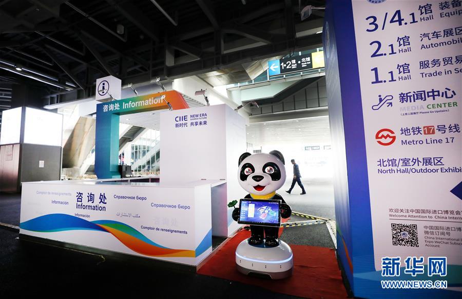 10月25日,位于國展中心內(nèi)的國家會議中心入口處張貼了醒目的進(jìn)博會吉祥物熊貓進(jìn)寶裝飾。 新華社記者 方喆攝