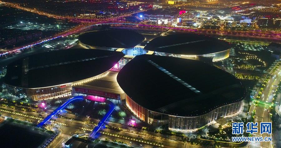 2019年11月5日,第二屆中國國際進(jìn)口博覽會將在上海開幕。夜幕下的國家會展中心(上海)燈光璀璨,流光溢彩,靜待八方賓客。新華社記者丁汀攝