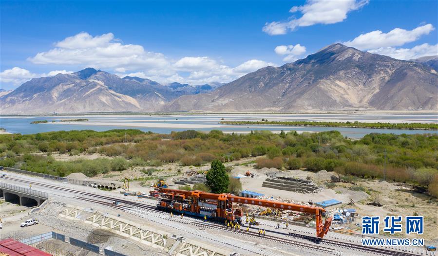 6月6日,負(fù)責(zé)鋪軌的中鐵十一局集團(tuán)的建設(shè)者在現(xiàn)場作業(yè)。新華社記者普布扎西攝
