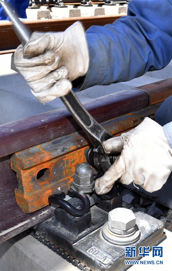 6月6日,負(fù)責(zé)鋪軌的中鐵十一局集團(tuán)的建設(shè)者在現(xiàn)場作業(yè)。新華社記者李鑫攝