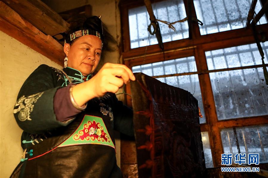 10月29日,楊芳在位于丹寨萬(wàn)達(dá)小鎮(zhèn)內(nèi)的工作室內(nèi)查看用蠟染工藝制成的真絲披肩。新華社記者 歐東衢 攝