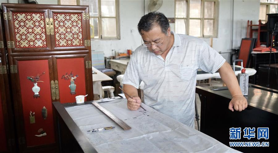 北京金漆鑲嵌有限責任公司工藝美術大師王學兵在繪制漆畫的底圖(10月31日攝)。新華社記者李欣攝