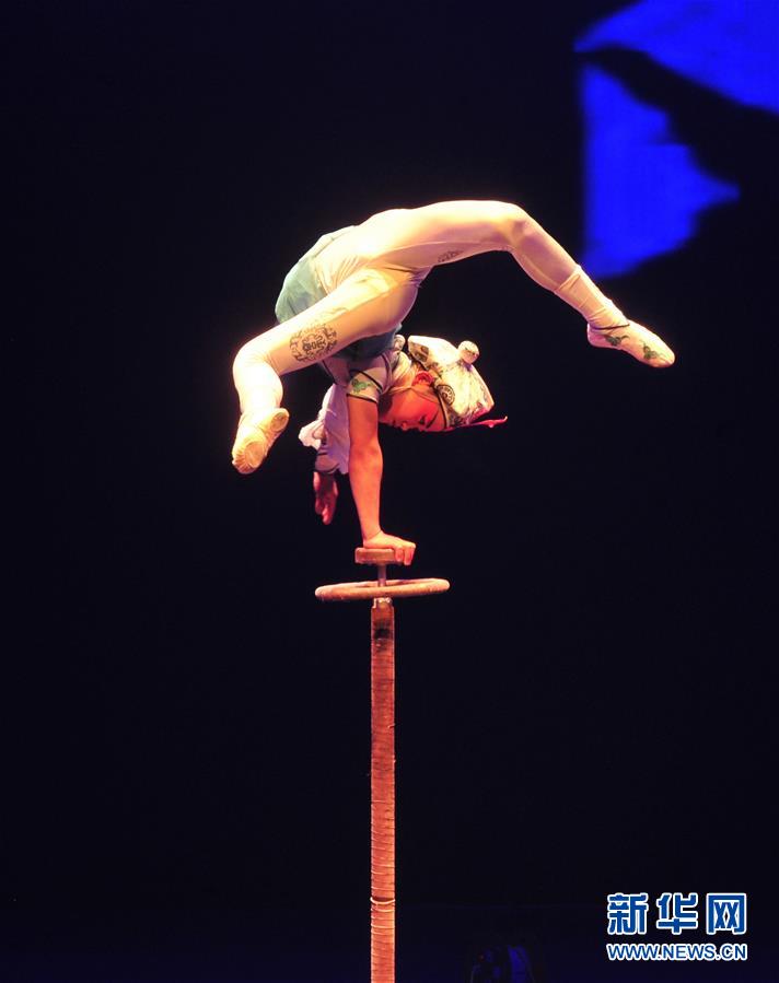 11月3日,河北省雜技團(tuán)演藝有限公司演員在表演《“生丑炫技”——倒立》。 新華社記者 牟宇 攝