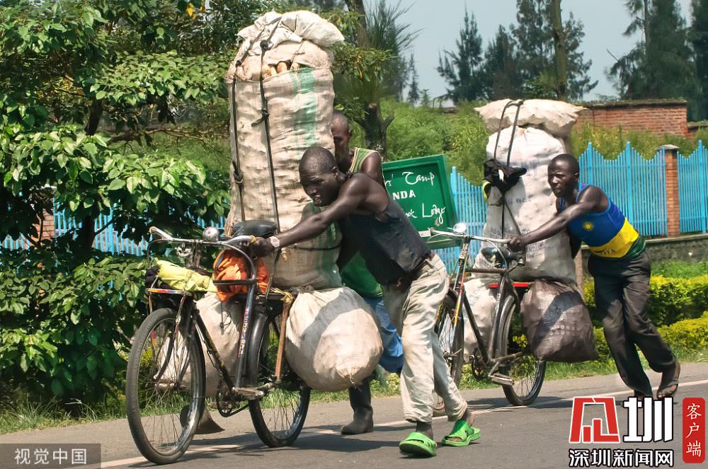 盧旺達,剛果和鄰國盧旺達的工人們每次要走20英里(約32公里)來運輸他們的貨物。從小村莊、農(nóng)場到城鎮(zhèn)里的市場,很多不同的貨物,如床墊和卷心菜都被小心地固定在了自行車上,它們要被掛著走很遠的路,之后到市場上被賣掉。一張圖拍攝的是一個人騎著一輛自行車,車后面載了7種不同顏色的床墊。很多自行車上都綁著裝大土豆的麻袋,這些麻袋重達30英石(約18千克),工人們將會把它們運到市場上賣掉。