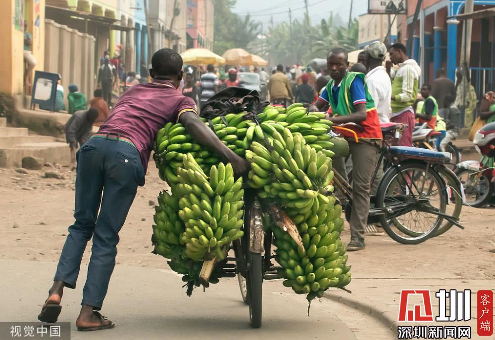 剛果,工人們將香蕉放在自行車上運(yùn)往市場。