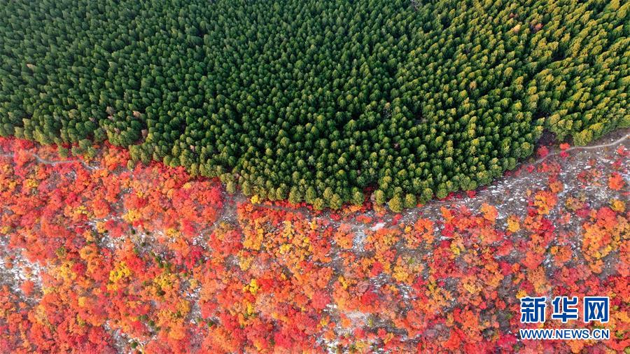 火紅的黃櫨樹林與綠色的松林沿濟(jì)南蝎子山山脊分布(11月4日無人機(jī)拍攝)。 新華社記者 朱崢 攝