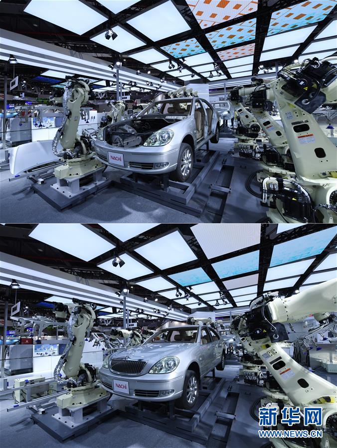 11月5日在第二屆進博會裝備展區(qū)日本那智不二越公司展臺拍攝的拼版照片。上圖是NACHI超高速點焊SRA系列機器人操作前的汽車骨架;下圖為間隔一分鐘后拍攝的NACHI超高速點焊SRA系列機器人操作后的汽車外殼。新華社記者范培珅攝