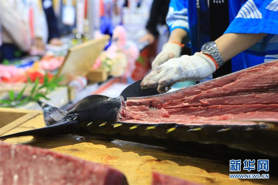 新11月7日,來(lái)自日本長(zhǎng)崎魚(yú)市株式會(huì)社的專(zhuān)業(yè)切魚(yú)師傅在現(xiàn)場(chǎng)解體70公斤藍(lán)鰭金槍魚(yú)。第二屆中國(guó)國(guó)際進(jìn)口博覽會(huì)正在上海國(guó)家會(huì)展中心舉行。博覽會(huì)的食品及農(nóng)產(chǎn)品展區(qū)里匯集了來(lái)自世界各地的美食,同時(shí)也上演各種精彩美食秀。11月7日,來(lái)自日本長(zhǎng)崎魚(yú)市株式會(huì)社的專(zhuān)業(yè)切魚(yú)師傅現(xiàn)場(chǎng)解體一條70公斤的藍(lán)鰭金槍魚(yú),吸引大量參觀者觀看、品嘗。新華社記者隋先凱攝