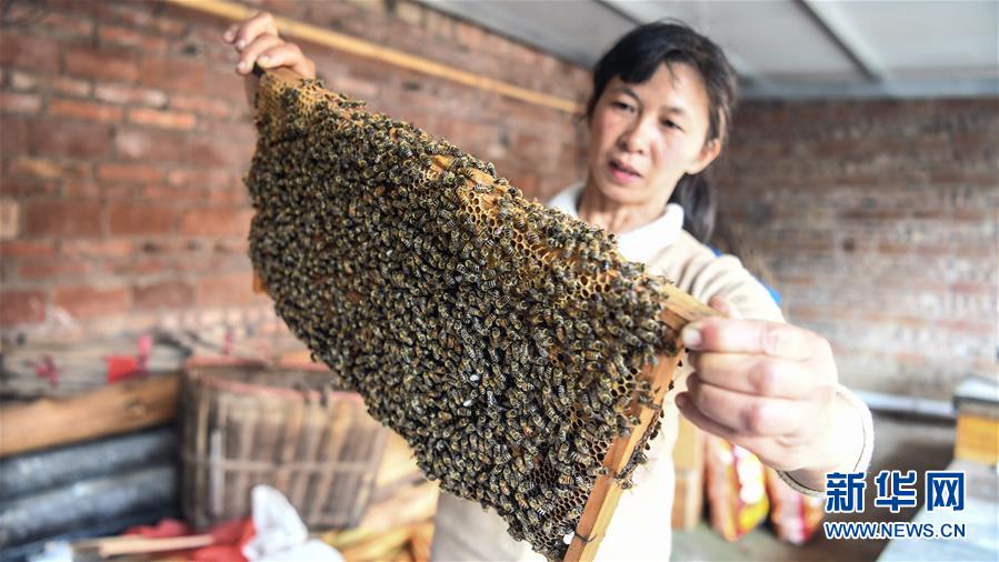 葉德華在查看蜜蜂的密集度,以便預留蜂蜜給它們越冬(11月12日攝)。 新華社記者張愛林攝