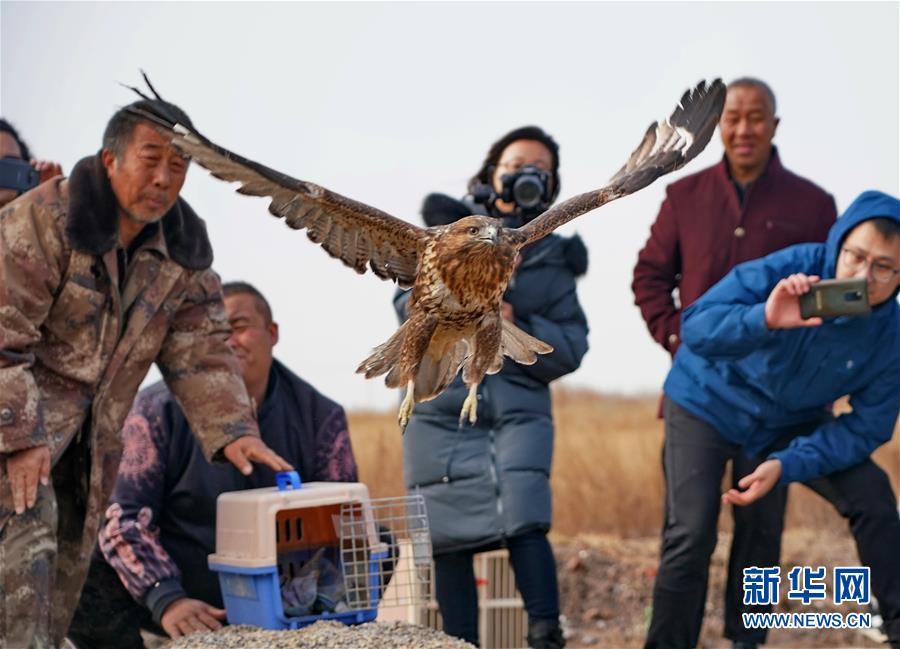 11月16日,在樂(lè)亭縣野生動(dòng)物保護(hù)協(xié)會(huì)大清河鳥(niǎo)類救助站,工作人員放飛一只普通鵟。新華社記者楊世堯攝