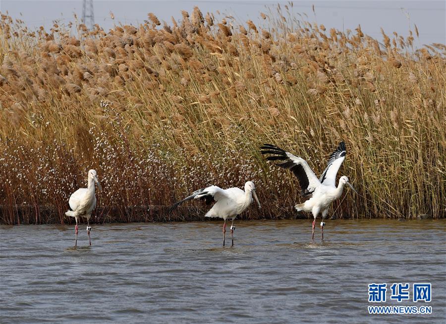 這是在樂亭縣野生動物保護協(xié)會大清河鳥類救助站放飛回歸大自然的三只國家一級保護動物東方白鸛(11月16日攝)。新華社記者楊世堯攝