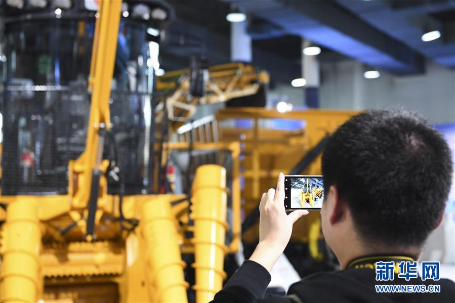 11月16日,參觀者在展會現(xiàn)場參觀甘蔗收割機(jī)械設(shè)備。新華社記者曹祎銘攝