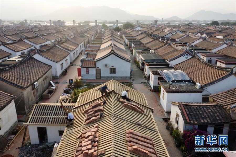 11月14日,埭美村村民在修繕一座古民居(無(wú)人機(jī)拍攝)。新華社記者姜克紅攝