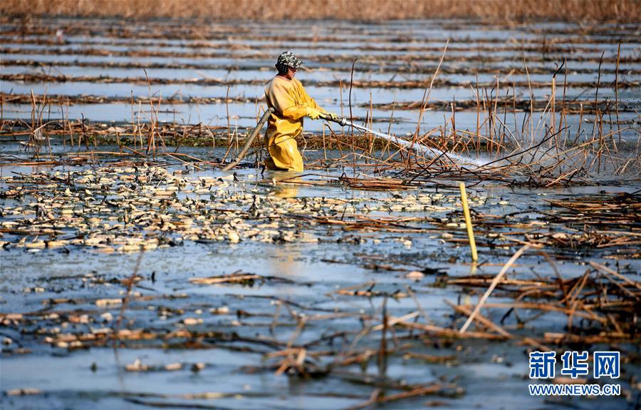 來(lái)自淮南的挖藕人張作志在肥西縣豐樂(lè)鎮(zhèn)一蓮藕種植基地用高壓水槍沖掉冰層。新華社記者劉軍喜攝