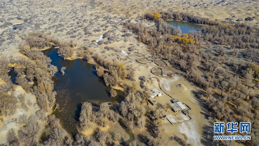 這是位于克里雅河尾閭的民居及胡楊林(11月16日無人機拍攝)。 新華社記者 胡虎虎 攝