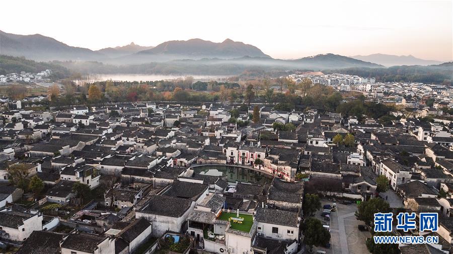 這是11月15日無人機(jī)拍攝的安徽黟縣宏村晨景。新華社記者張笑宇攝