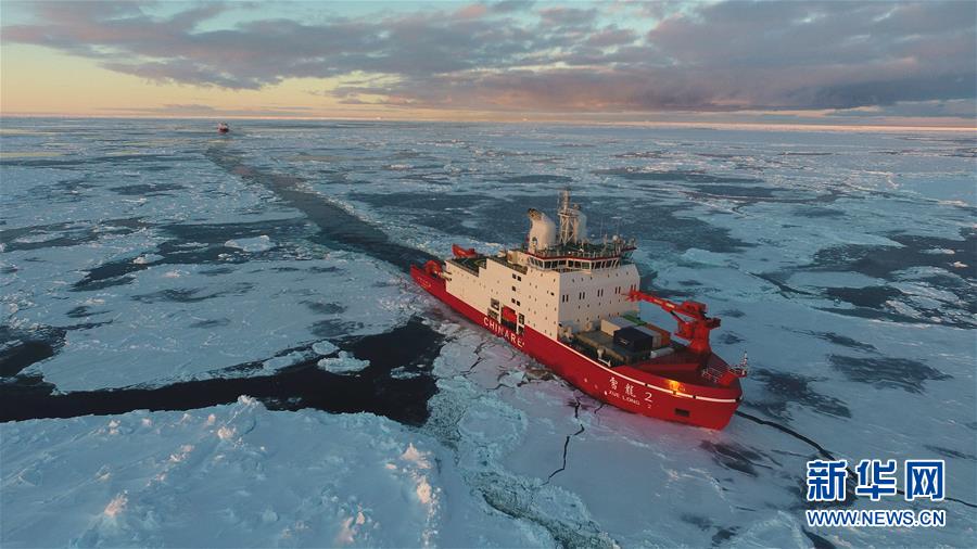 航行在南極圈內(nèi)浮冰區(qū)的“雪龍2”號和“雪龍”號(11月19日無人機(jī)拍攝)。新華社記者劉詩平攝