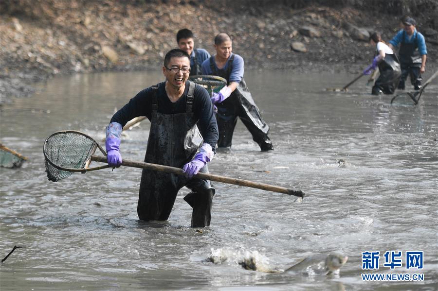 杭州:游客體驗(yàn)“干塘”捕魚(yú)