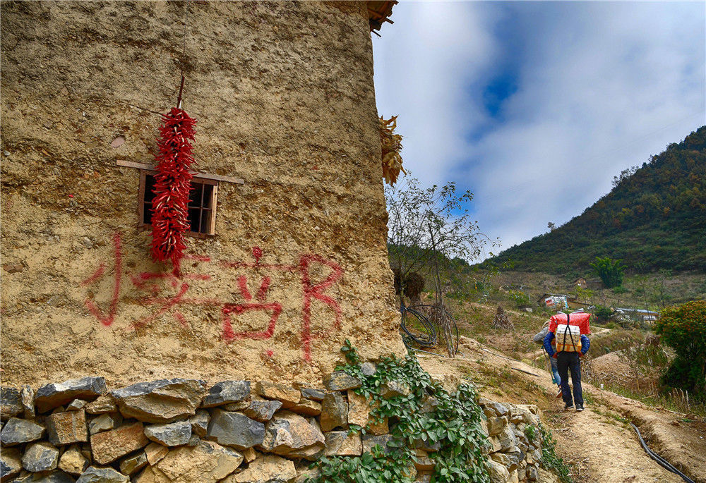 2019年11月16日,四川涼山,楊陽背著快遞行走在村里,路過村上才開的小賣部。