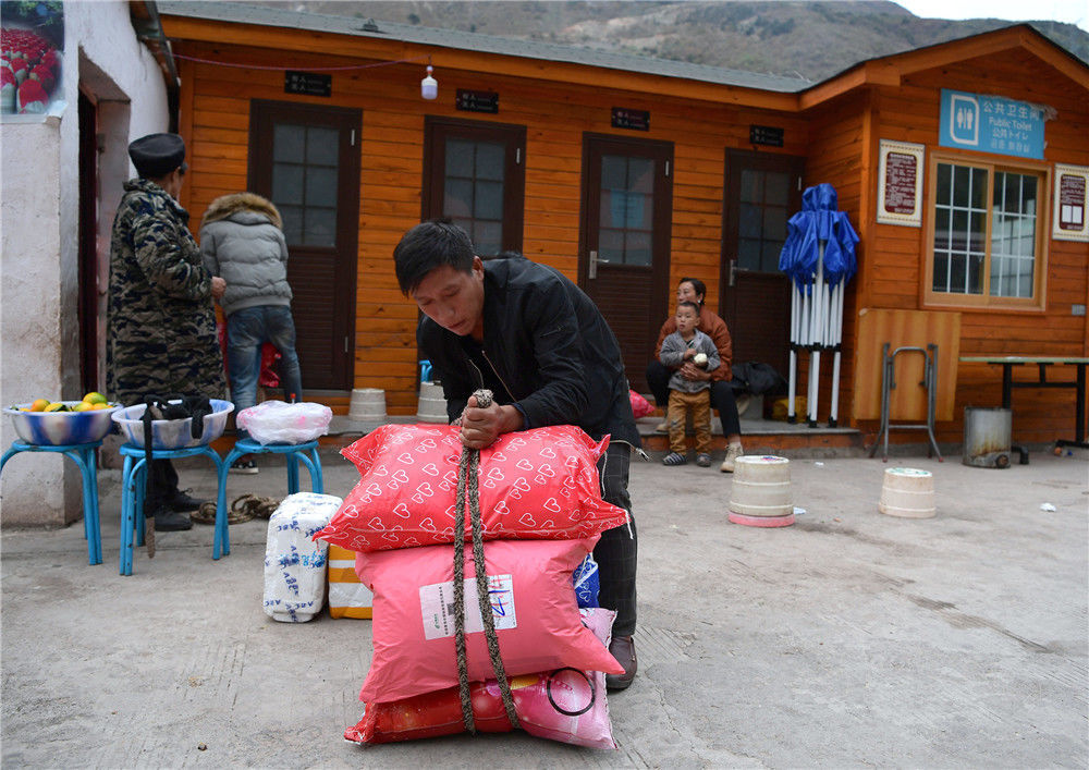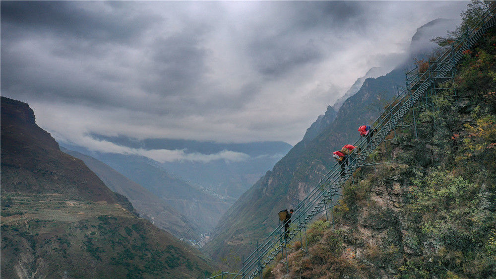 2019年11月16日,四川涼山,背著快遞包裹回家,成為懸崖村天梯上的新風景。