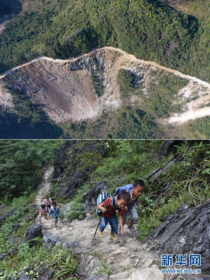 拼版照片:上圖為剛剛修通公路的大化瑤族自治縣板升鄉(xiāng)八好村弄麻屯(11月11日無人機拍攝);下圖為在尚未通路的八好村弄麻屯,孩子們爬山路回家(2016年9月23日攝)。新華社記者黃孝邦攝