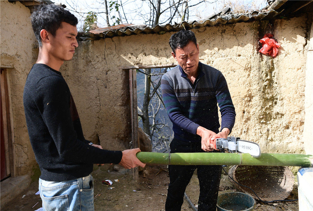2019年11月16日,四川涼山,楊陽的父親某色蘇拉澤正在安裝電鋸。