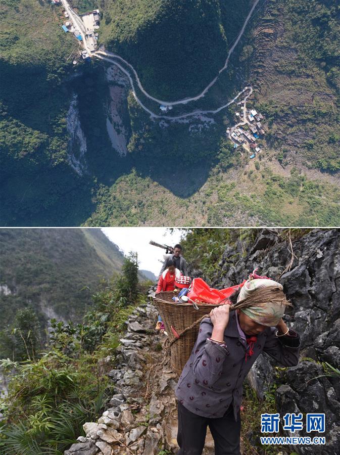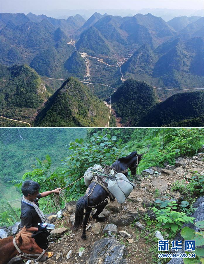 拼版照片:上圖為已經修通水泥路的大化瑤族自治縣板升鄉(xiāng)八好村八好屯(11月11日無人機拍攝);下圖為在尚未通路的八好村八好屯,村民背著年貨走山路回家(2016年1月26日攝)。新華社記者黃孝邦攝