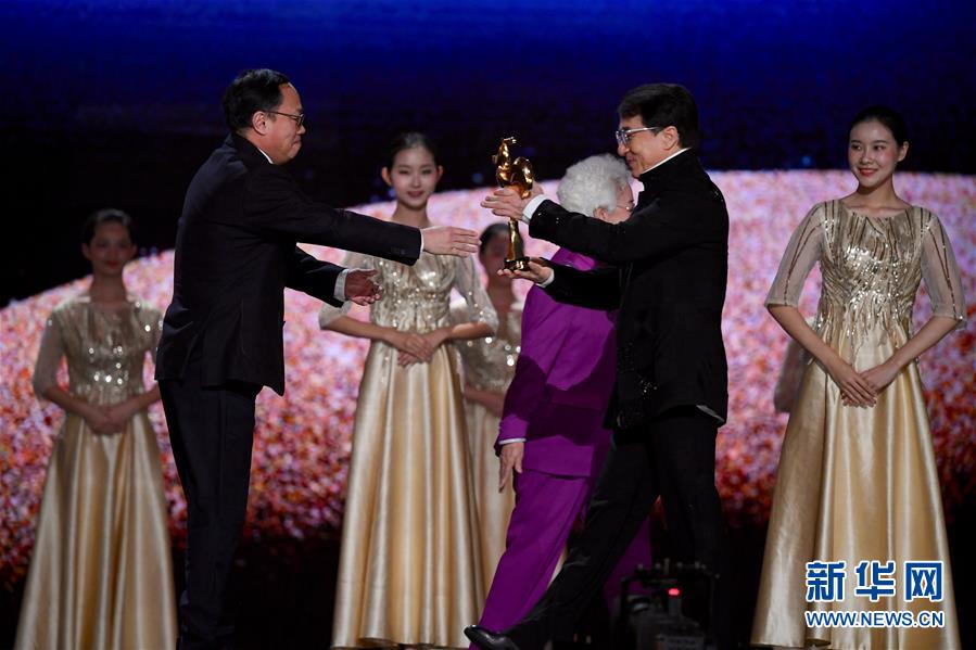 11月23日,電影《流浪地球》獲得最佳故事片獎,成龍在為電影出品方代表頒獎。 當日,第32屆中國電影金雞獎頒獎典禮在福建廈門舉行。 新華社記者 姜克紅 攝