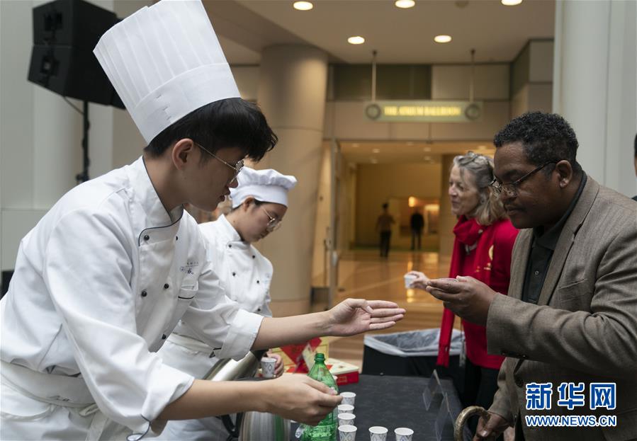 11月22日,在美國華盛頓,人們在“北京日”文化廟會活動上品嘗中國小吃。作為中國北京和美國首都華盛頓締結(jié)友好城市35周年慶?;顒拥囊徊糠郑氨本┤铡蔽幕瘡R會22日在華盛頓羅納德·里根大廈和國際貿(mào)易中心舉行。新華社記者劉杰攝