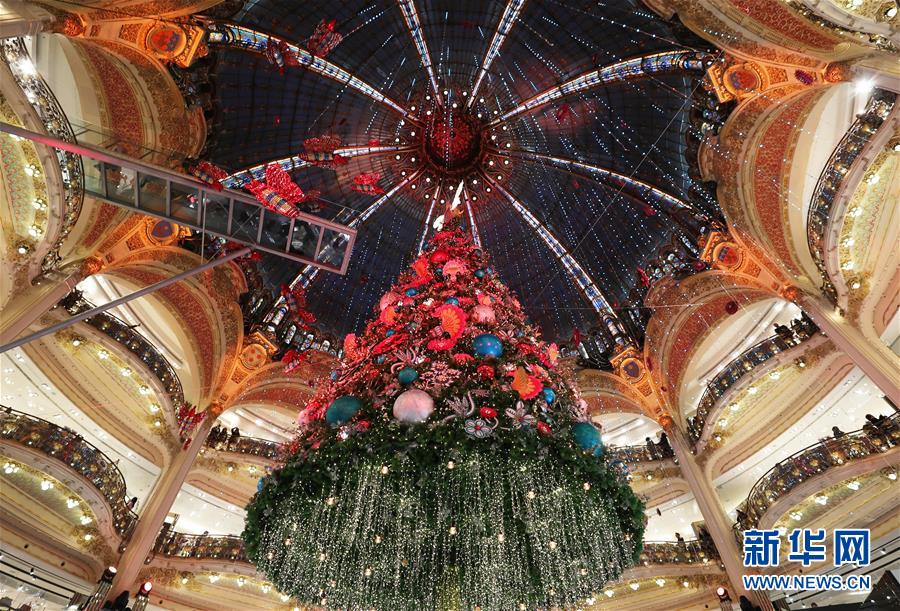 這是11月24日在法國巴黎老佛爺百貨公司拍攝的點(diǎn)燈后的巨型圣誕樹。 新華社記者高靜攝
