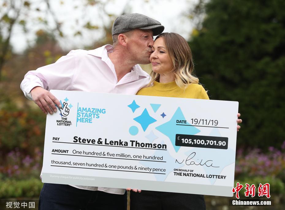 當(dāng)?shù)貢r(shí)間11月26日,英國奇切斯特一對(duì)普通工作者幸運(yùn)贏得足以改變?nèi)松莫?jiǎng)金——1.05億英鎊。圖片來源:視覺中國