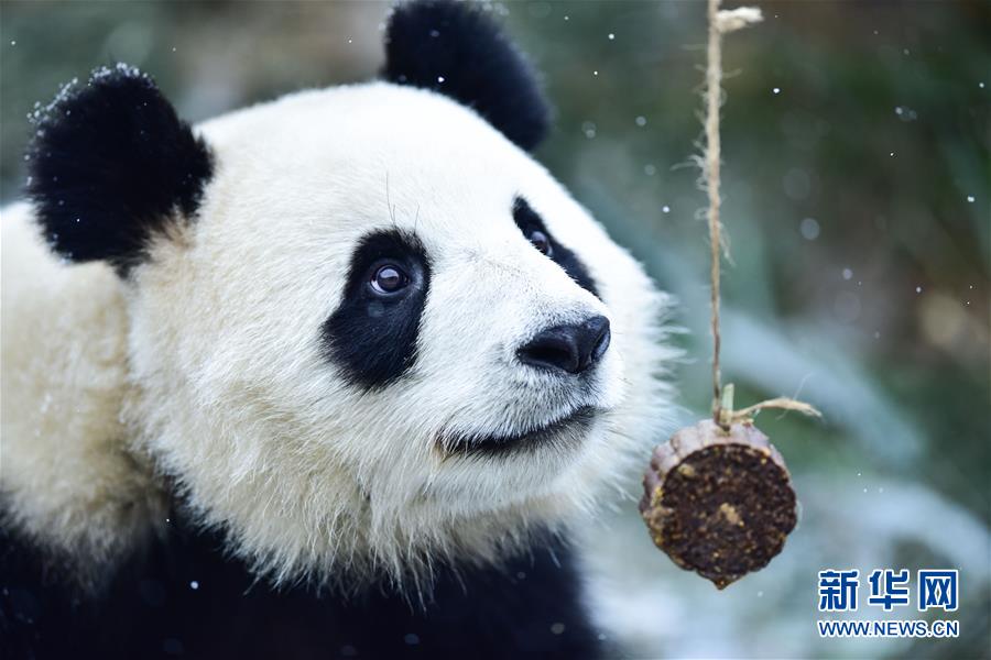 11月29日,在西寧熊貓館內(nèi),一只大熊貓在吃飼養(yǎng)員投送的食物。  新華社記者 吳剛 攝