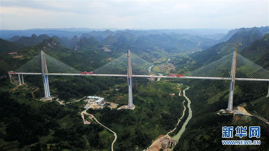 當(dāng)日,貴州平塘至羅甸高速公路控制性工程平塘特大橋成功合龍,該橋擁有332米高的全球最高混凝土橋塔。新華社記者楊文斌攝