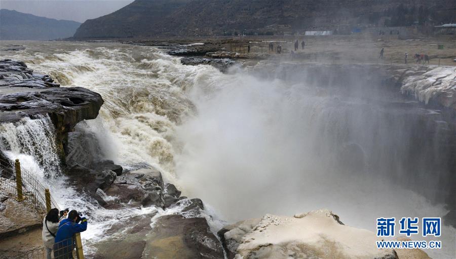 12月14日,游人在壺口瀑布景區(qū)拍照(無人機拍攝)。 新華社記者 陶明 攝