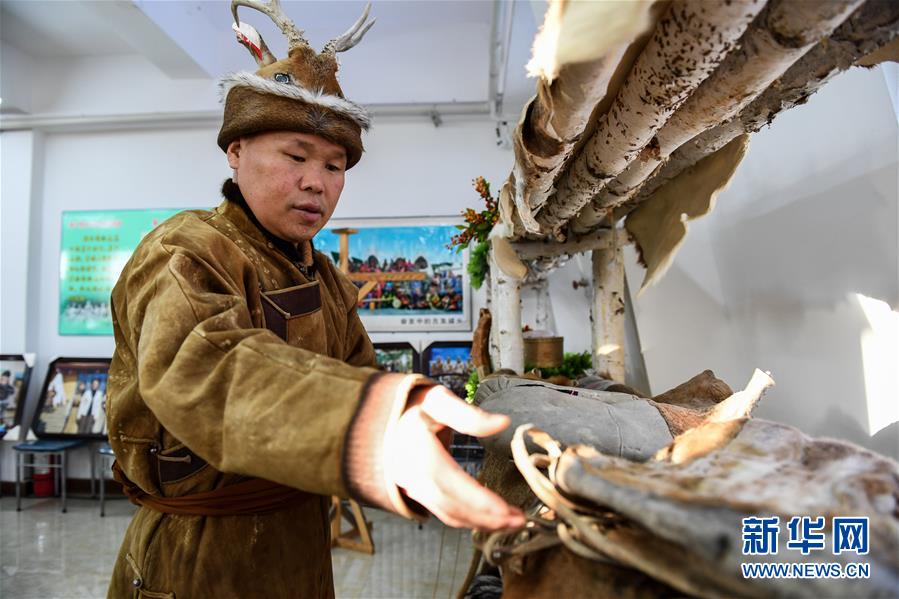 12月10日,在古里鄉(xiāng)非遺傳習(xí)所,鄂倫春族人吳曲忠在整理皮毛制品。新華社記者劉磊攝