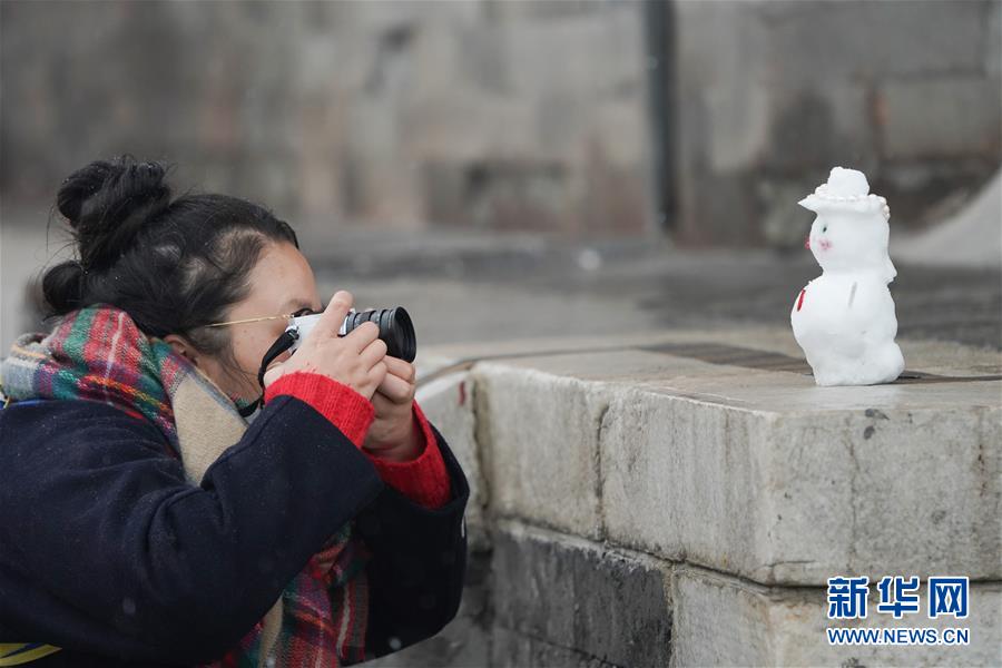 12月16日,在北京天壇公園,一名女士拍攝小雪人。當(dāng)日,北京迎來降雪天氣。新華社記者鞠煥宗攝