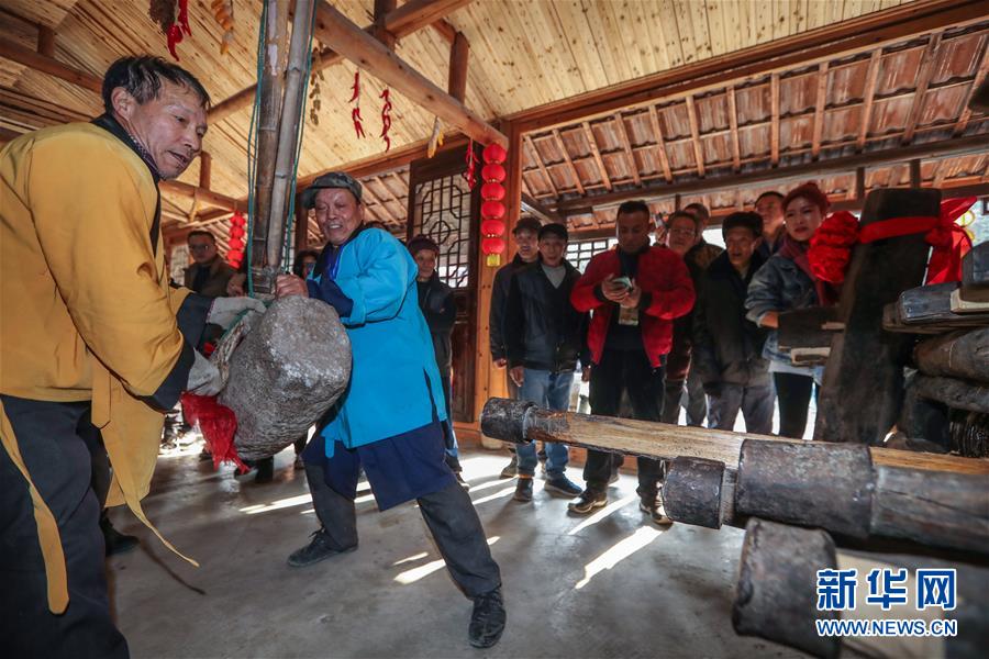 12月15日,工作人員在老油坊內通過撞擊的方式將不同尺寸的木楔插入木龍,進而榨出茶餅中的茶油。 新華社記者 徐昱 攝