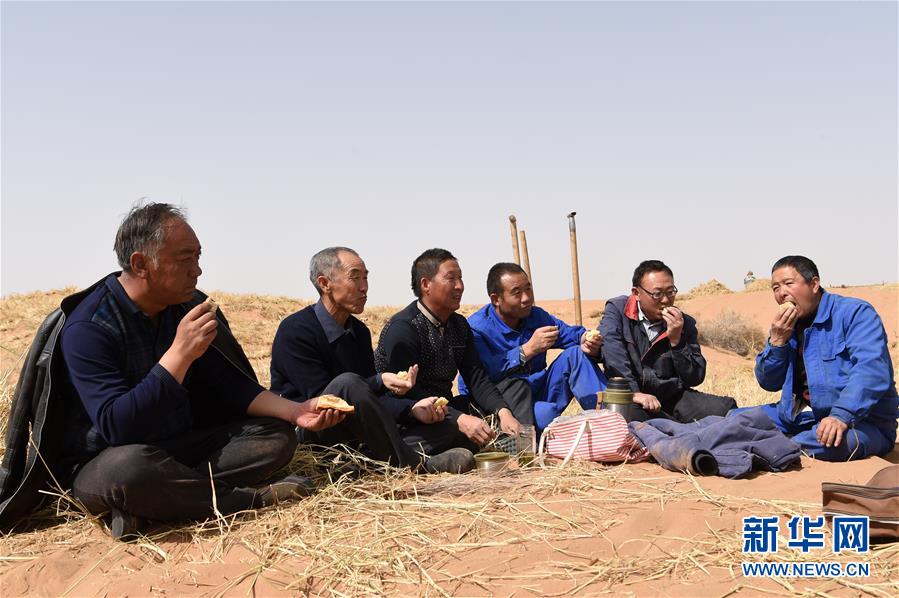 在甘肅省古浪縣境內的黑崗沙風沙口,八步沙第二代治沙人賀中強(左一)、郭萬剛(左二)、石銀山(左三)、羅興全(右三)、程生學(右二)、王志鵬(右一)在休息間隙吃午飯(3月26日攝)。二十世紀八十年代,八步沙是騰格里沙漠南緣甘肅省古浪縣最大的風沙口。當?shù)亓荒挲g加在一起近300歲的老漢,在承包沙漠的合同書上按下手印,誓用白發(fā)換綠洲。38年過去,六老漢只剩兩位在世。