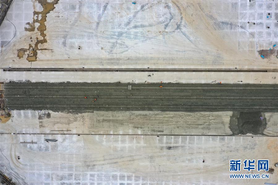 12月17日,中鐵八局建設(shè)者們在改貌鐵路口岸施工(無人機(jī)拍攝)。 新華社記者 劉續(xù) 攝