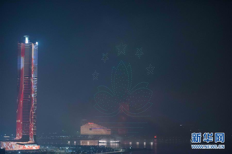 12月22日拍攝的煙花匯演上的無(wú)人機(jī)表演。當(dāng)晚,澳門與珠海首次聯(lián)合舉行煙花匯演,慶祝澳門回歸祖國(guó)20周年。新華社記者張金加攝