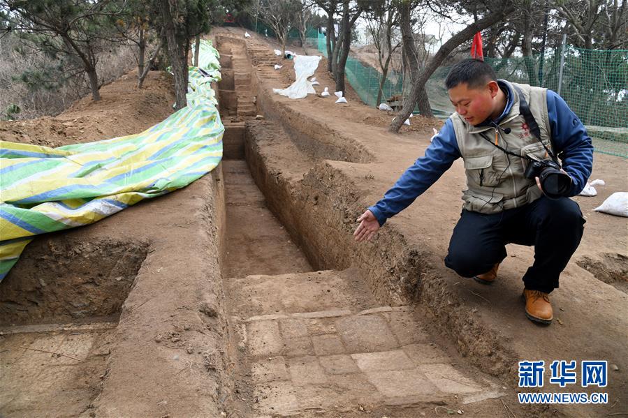 考古隊(duì)員在瑯琊臺(tái)遺址考古發(fā)掘現(xiàn)場(chǎng)介紹發(fā)掘出的秦漢時(shí)期的石砌道路(12月21日攝)。新華社記者李紫恒攝